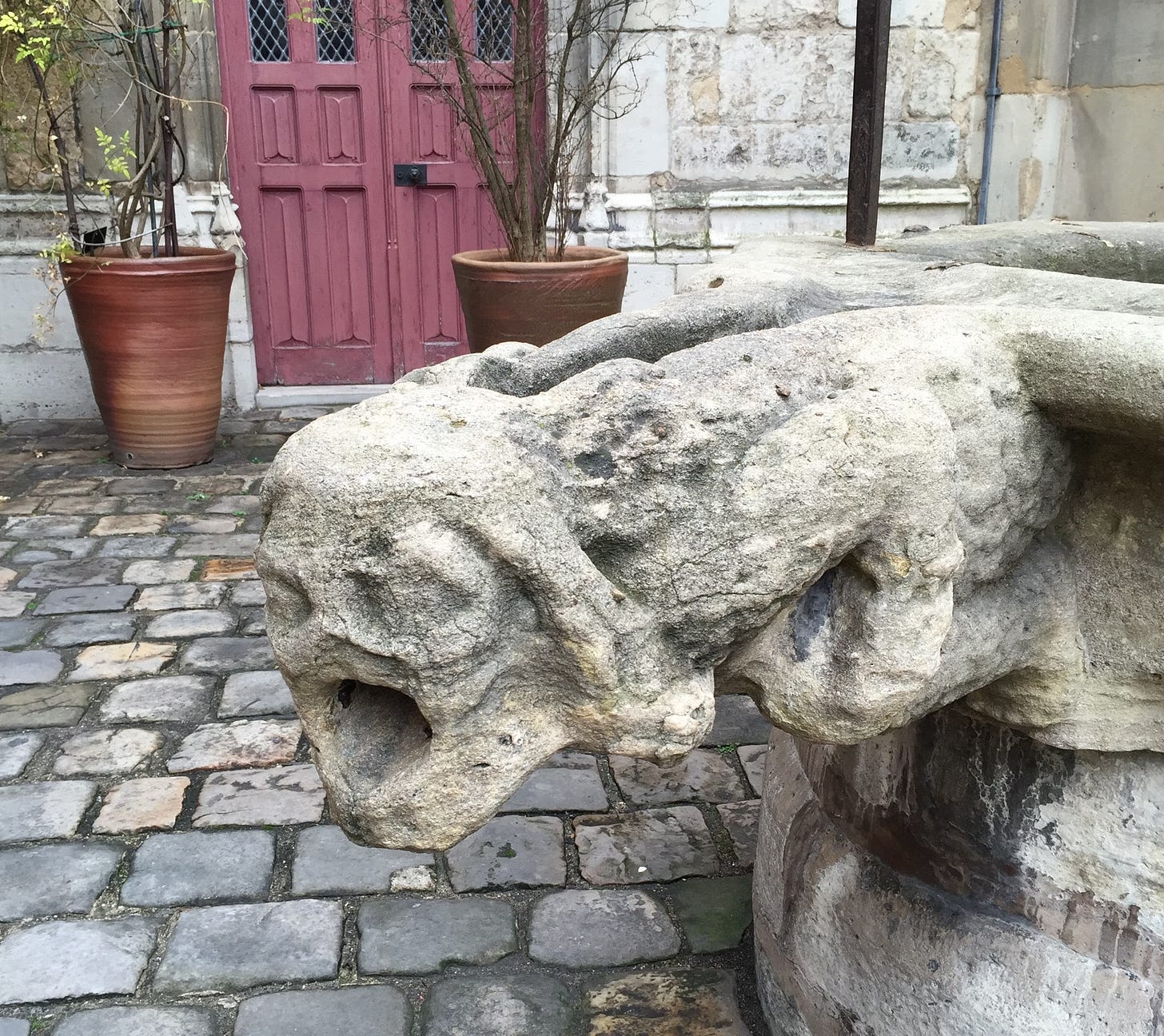 The remnants would have been demolished in 1485 by Jacques d’Amboise, the Abbot of Cluny who built the turreted mansion that now adjoins them, had he not been a fiscally responsible man. Dismantling the baths would have added an exorbitant amount to his construction costs so he used parts of the old structure to support the new one—a frugal move that bestowed a blessing on lovers of ancient architecture. When the mansion was finished in 1510, it was christened the Hôtel de Cluny because it would be the abbot’s home when he was in town and would house the monks he oversaw. (2) The Musée national du Moyen Âge took over the building in 1843 when Alexandre du Sommerard, who owned the mansion from 1833 to 1842, bequeathed it to the city to serve as a venue for the artifacts he had avidly collected. (3) Entering the museum’s courtyard is like sliding through the looking glass, the feel of otherworldliness enhanced by a dilapidated well with a half-eaten-away gargoyle gaping at its edge.