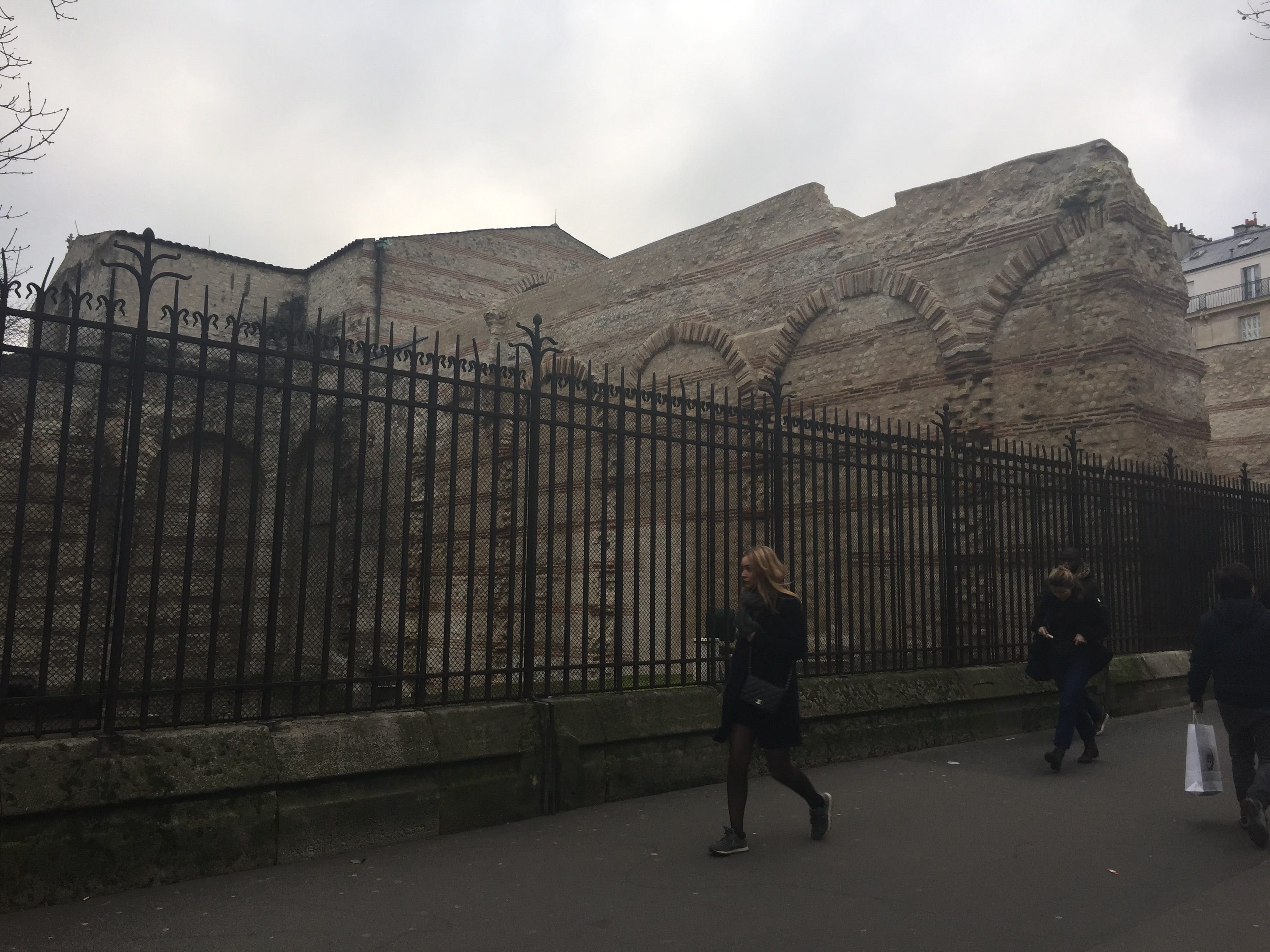 In order to comprehend how small the footprint of the city was when Julian was in residence, I decided to make my way to the Thermes from the corner where the maps of Roman Paris situate the fortress. It predated the Palais de la Cité, Conciergerie, Palais de Justice, and Sainte-Chapelle that now rise from the plat of land. To imitate the only route he could have walked in 360 A.D. given the Petit Pont was the sole bridge between the island and what is now the Left Bank, I traversed the river across it and trekked up Rue Saint-Jacques to Boulevard Saint-Germain. As I turned the corner to approach the museum, I marveled at the scale of the ragged walls splayed beyond the medieval garden, though I’d seen the artifacts with their tattered edges several times. There was something about their roughness that made them seem brutally arrogant.