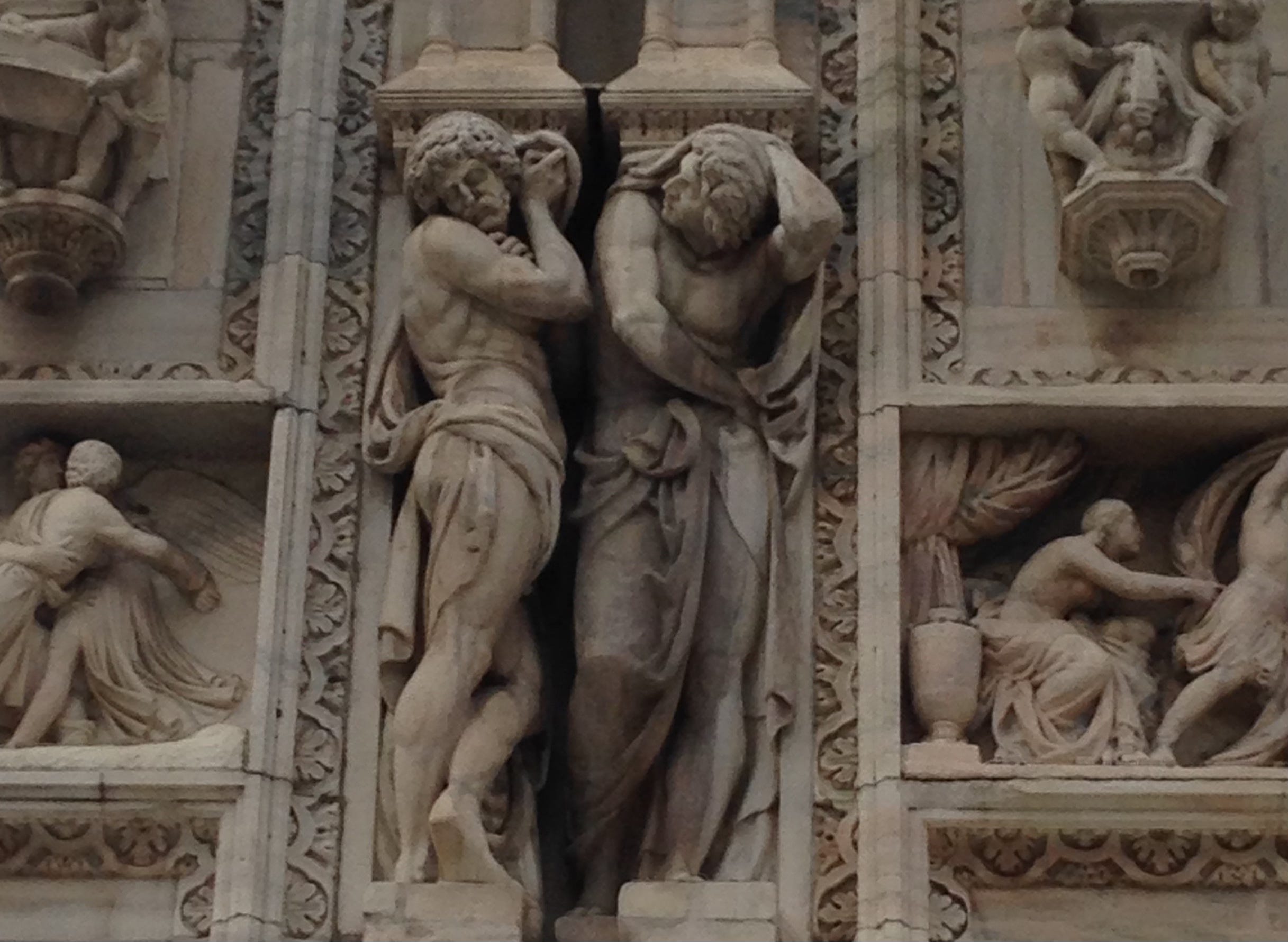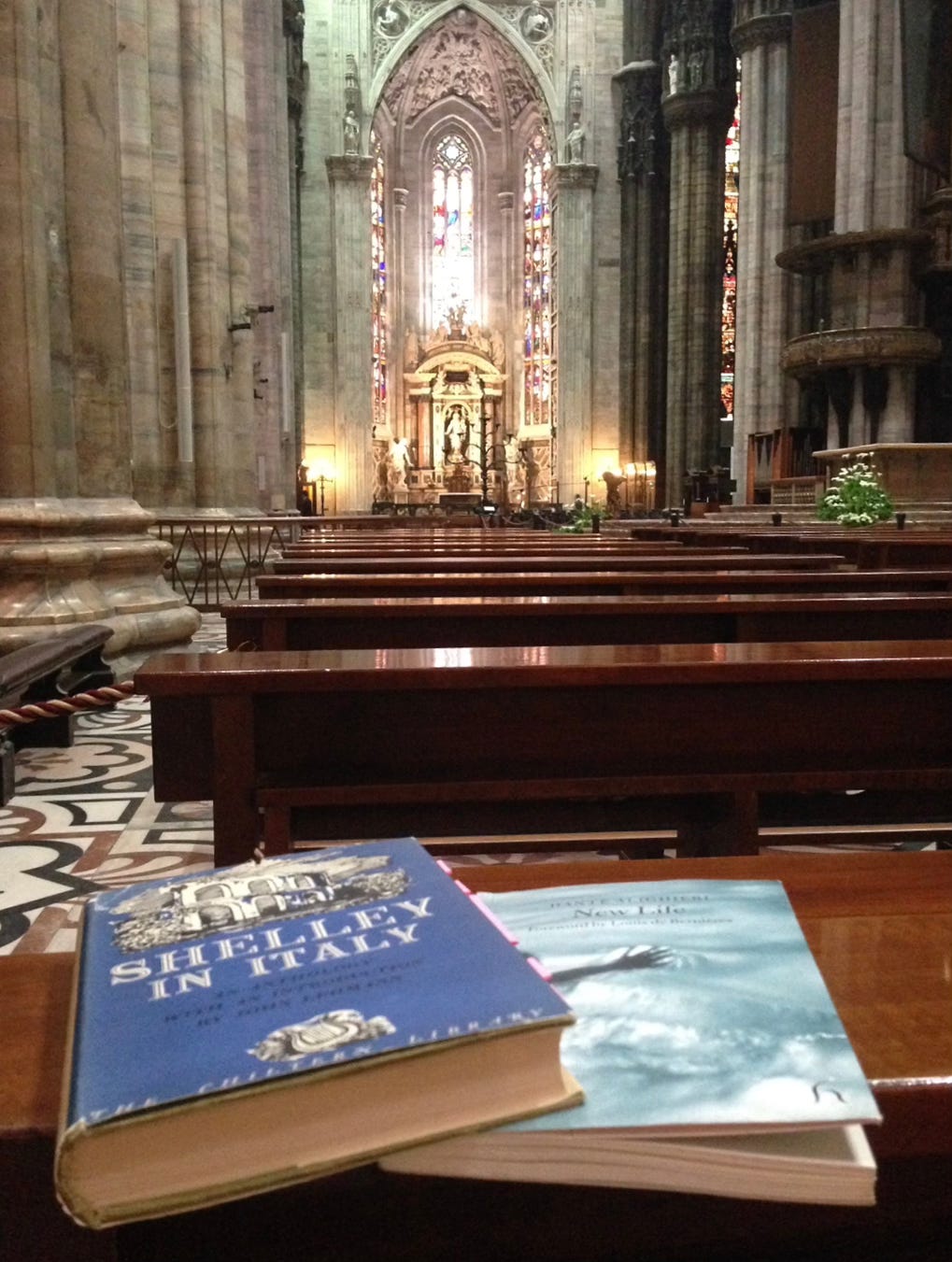 “This cathedral is a most astonishing work of art,” he told his friend. “It is built of white marble, and cut into pinnacles of immense height, and the utmost delicacy of workmanship, and loaded with sculpture. The effect of it, piercing the solid blue sky with those groups of dazzling spires, relieved by the serene depth of this Italian heaven, or by moonlight when the stars seem gathered among those clustered shapes, is beyond anything I had imagined architecture capable of producing.” (1) During one of my trips to Milan, I took a pilgrimage to the Duomo with two books in hand—Shelley in Italy and Dante Alighieri’s The New Life, choosing the latter because Shelley told Peacock he passed several afternoons in the church reading Dante’s works. The closer I drew to the exterior of the building, the more impressed I was that anyone had ever had the courage to create such an intricate façade! The stories that spring to life in the sculptures are told by downcast figures sentenced to supporting great columns on their backs for as long as the building stands. They are surrounded by bas reliefs depicting humanity struggling just as valiantly within their own allegorical universes. The transition from these mythic masterpieces that gleamed in the strong sunlight made it necessary to pause after the gigantic door closed behind me so my eyes could adjust to the muted light inside. I hoped to find a pew as close to the section of the cathedral Shelley described but I had to choose a seat fairly far away so as not to disburb churchgoers worshiping near the pew he had occupied.